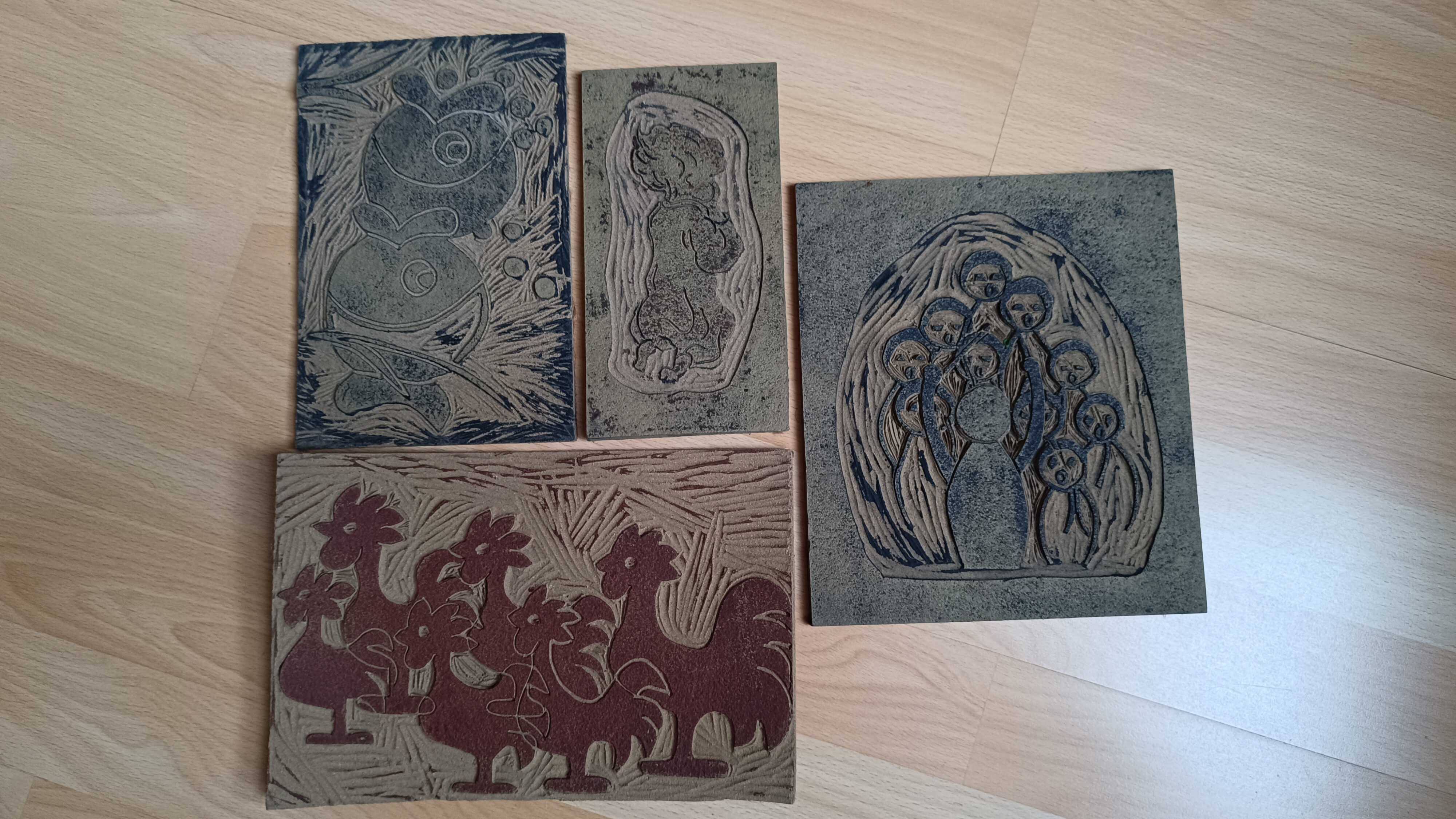 Hanneke heeft kort geëxperimenteerd met linoleum. Het kleinste werkstukje is een replica van de raamschildering die ze had gemaakt op het badkamerraam in haar huis in Papendrecht.